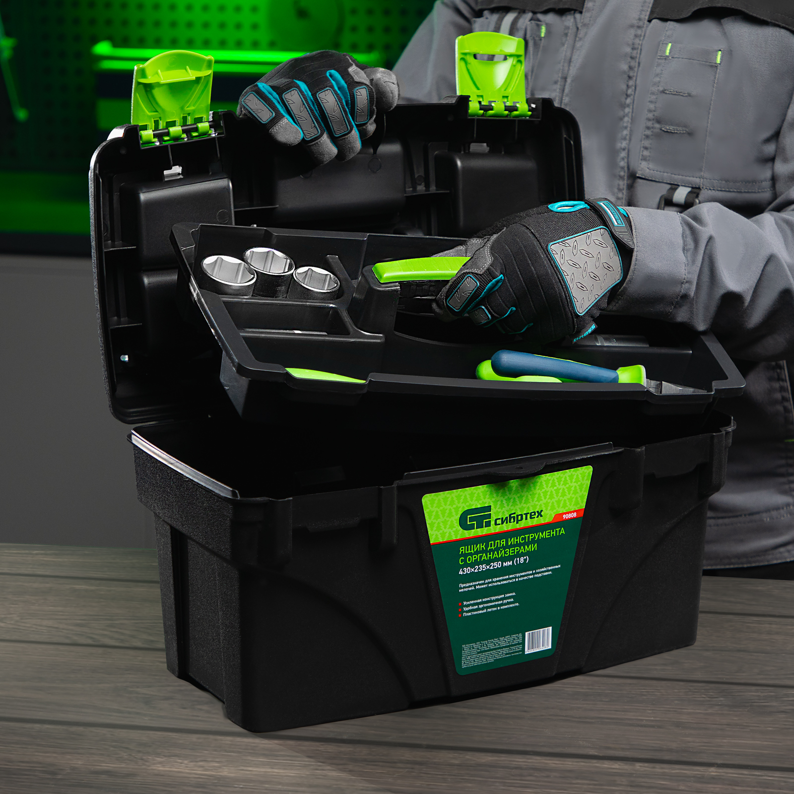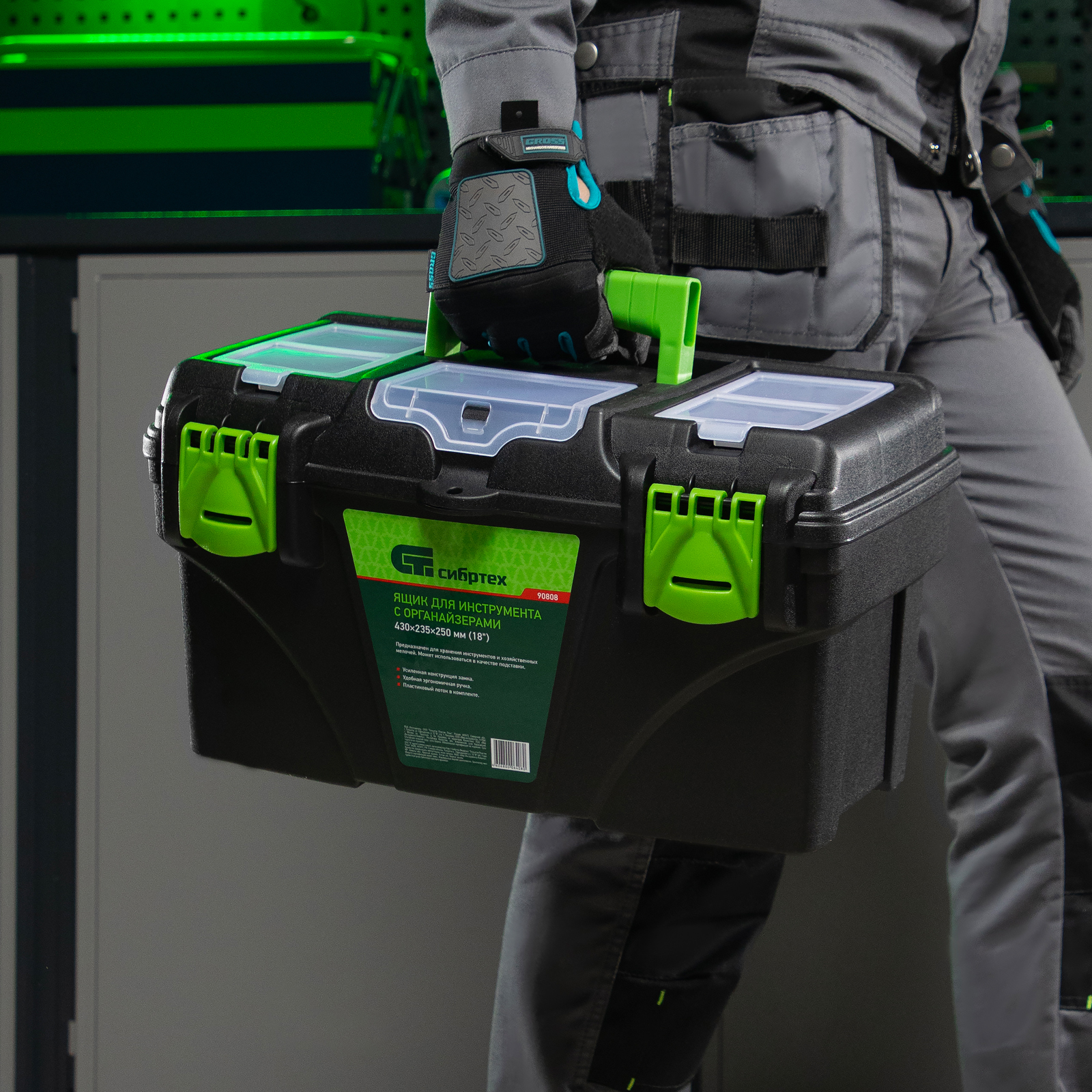 Ящик Сибртех 90808 длиной 18", с органайзерами, используется для хранения и транспортировки инструментов, оснастки, крепежа, хозяйственных мелочей и других предметов. Крышка и замок усилены трехрядными петлями, поэтому ящик выдерживает вес содержимого до 50 кг. Съемный лоток позволяет оптимизировать пространство внутри ящика. Его можно брать в поездку, также он пригодится дома, на даче или в гараже.