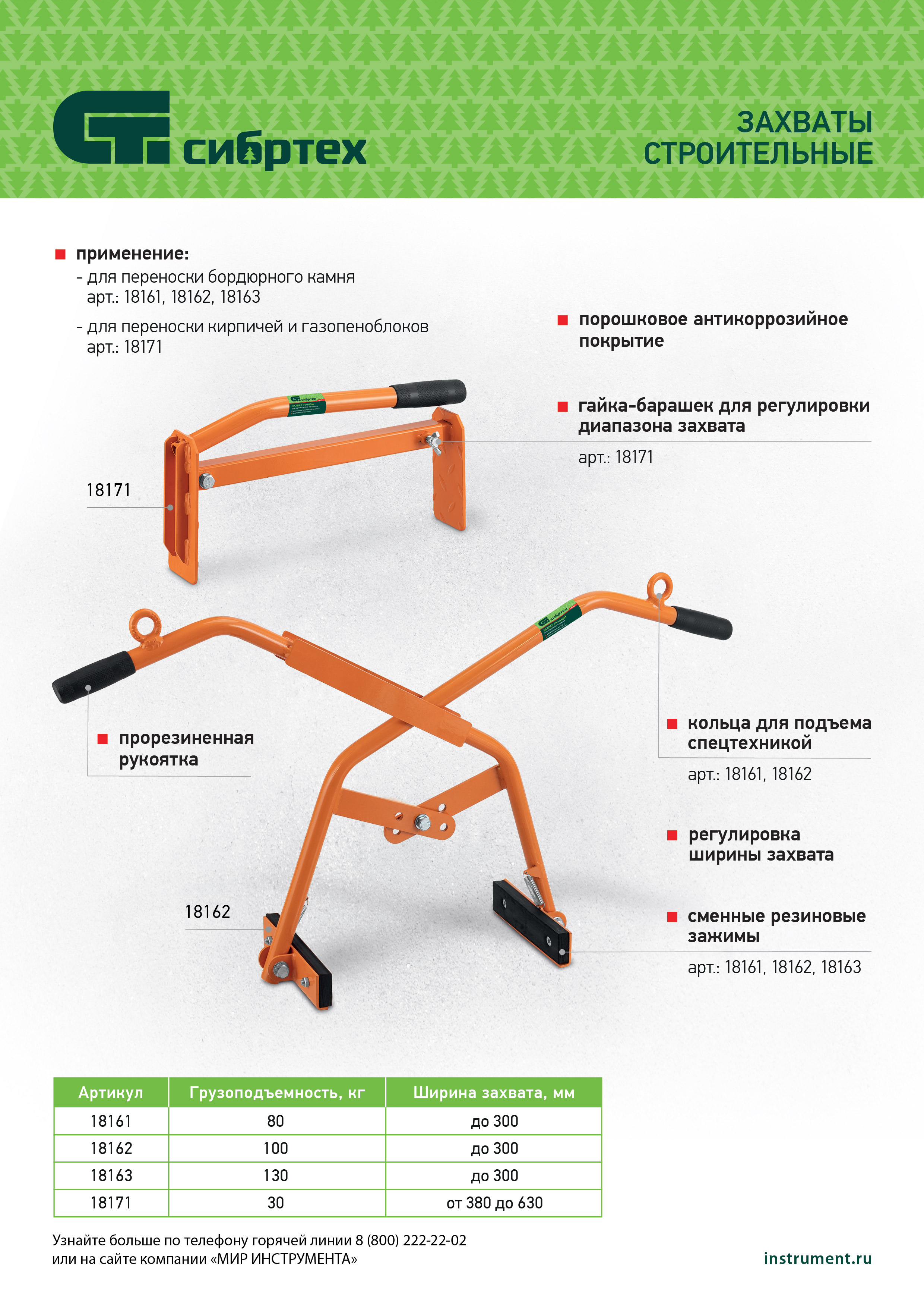 Ручной захват для бордюрного камня Сибртех 18163 — удобный и надежный инструмент, применяемый для установки дорожных бордюров, поребриков, бортового камня массой до 130 кг.