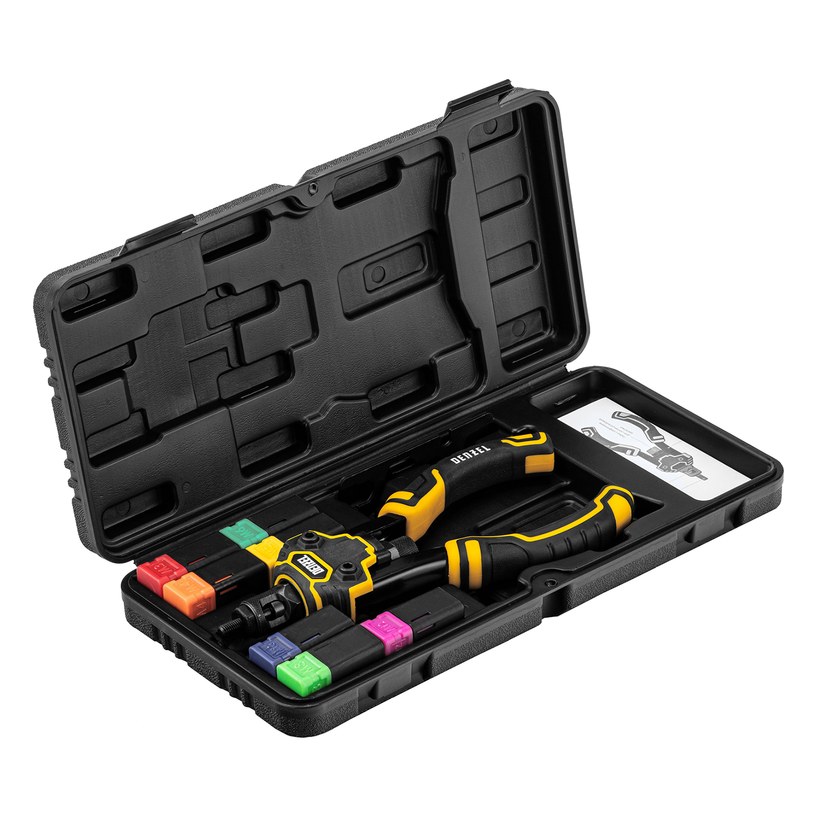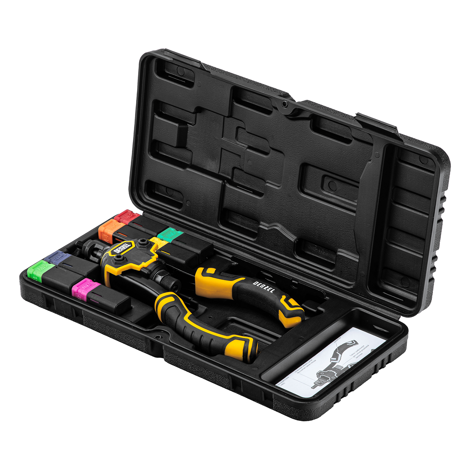 Заклепочник - 1 штШток М3*0,5 - 1 штШток М4*0,4 - 1 штШток М5*0,8 - 1 штШток М6*1,0 - 1 штШток М8*1,25 - 1 штШток М10*1,5 - 1 штШток М12*1,75 - 1 штКлюч - 1 штКейс пластиковый - 1 шт |