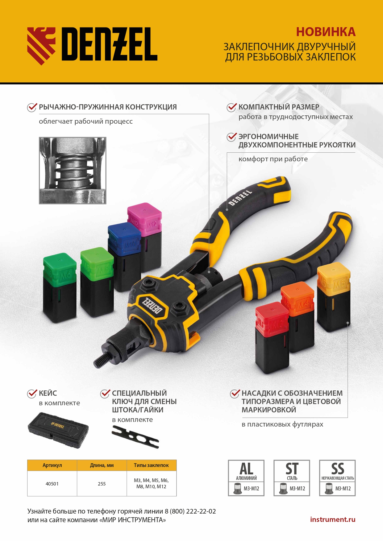 - Продуманная комплектация — заклепочник поставляется с ключом для быстрой установки насадок.