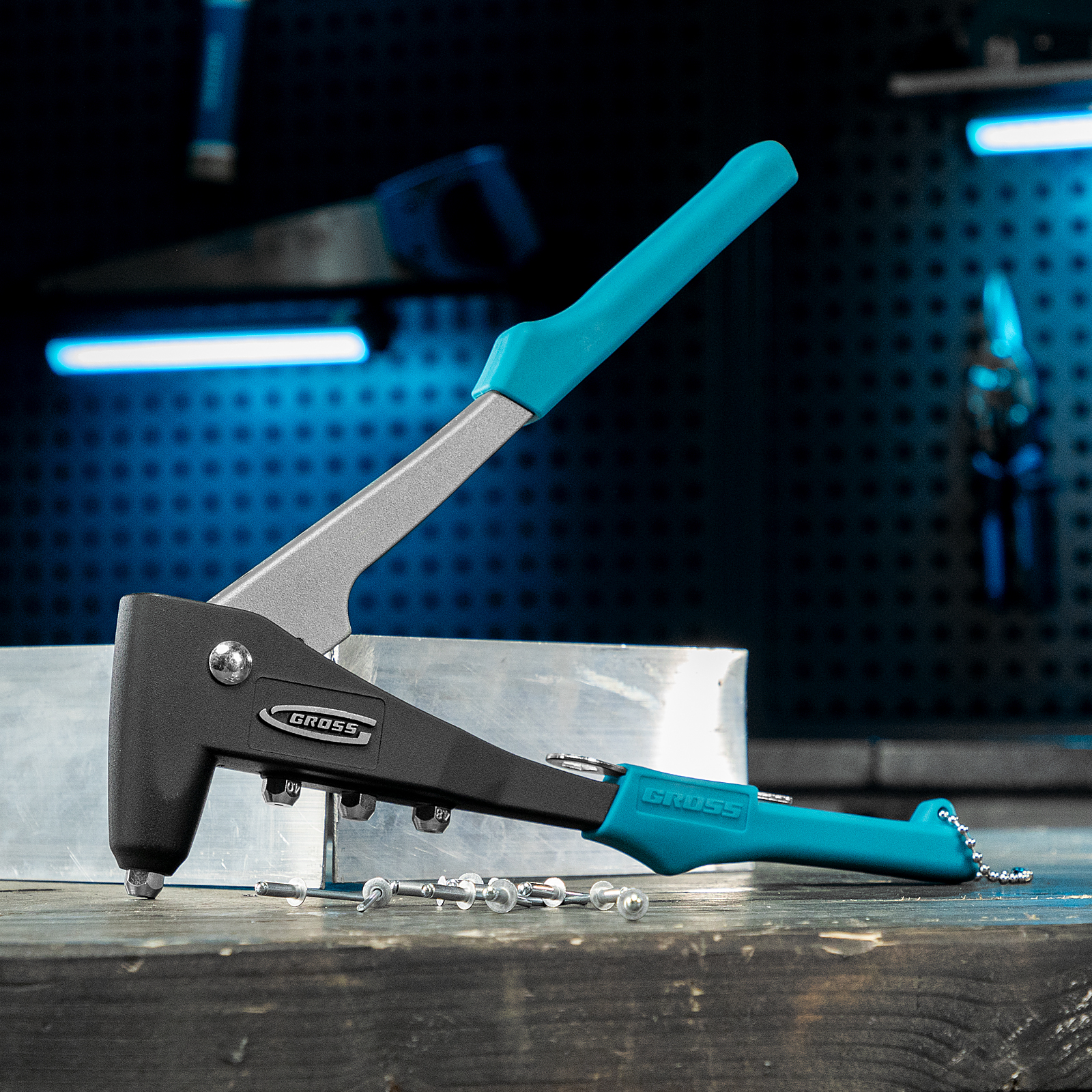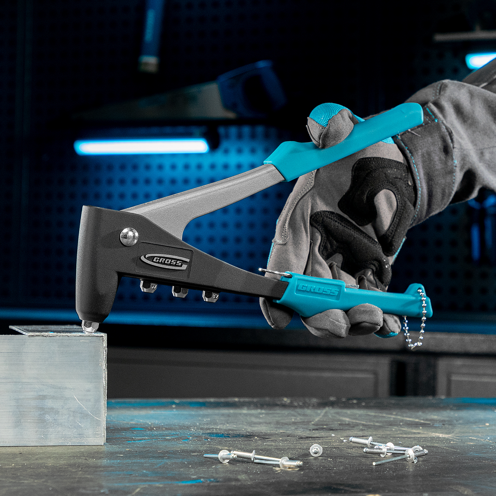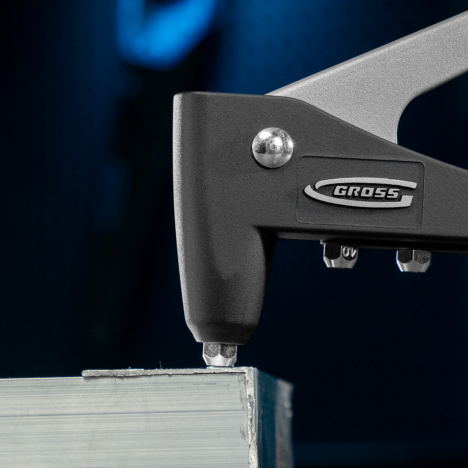 - Стальной штампованный рычаг и литой корпус обеспечивают устойчивость к нагрузкам и высокий эксплуатационный ресурс заклепочника.