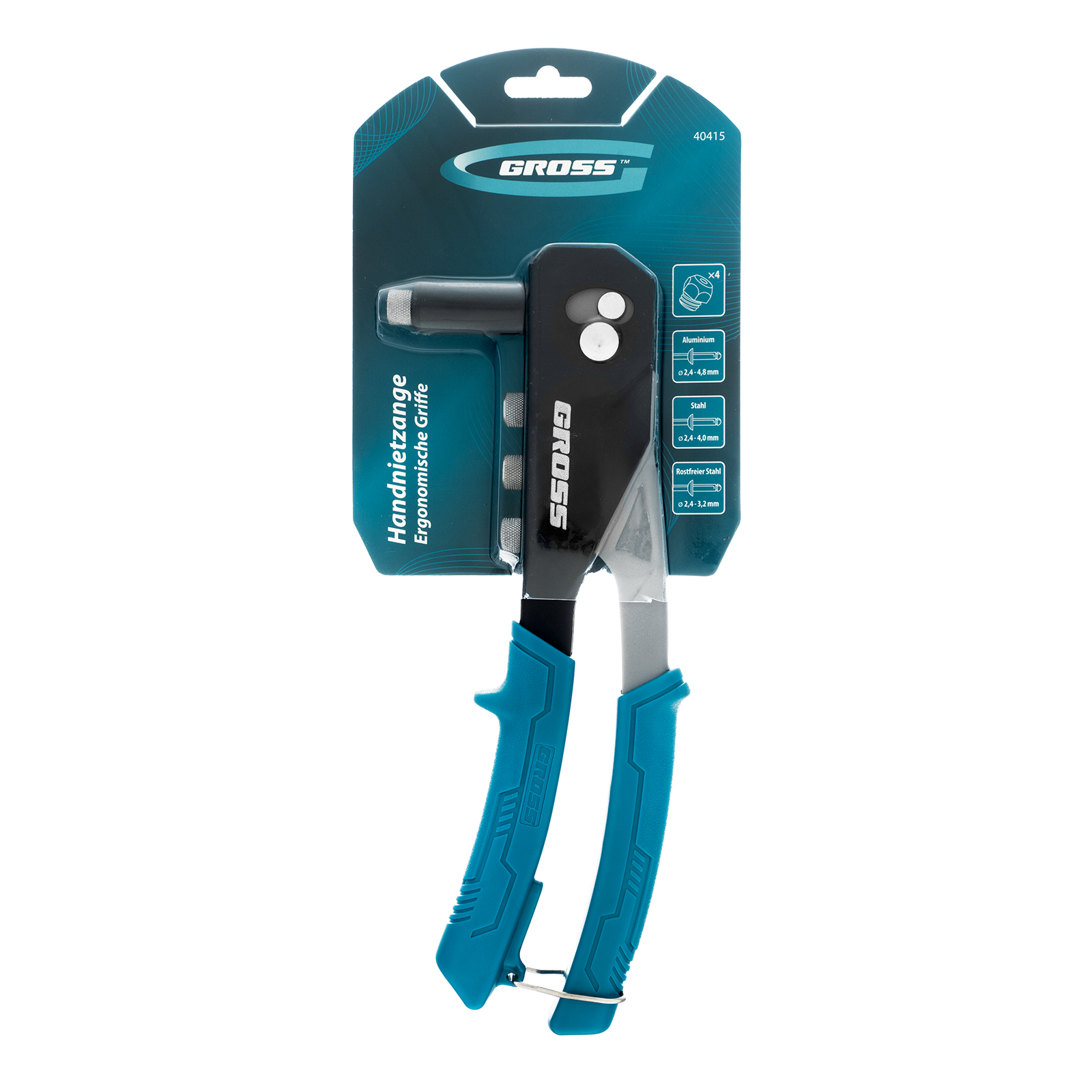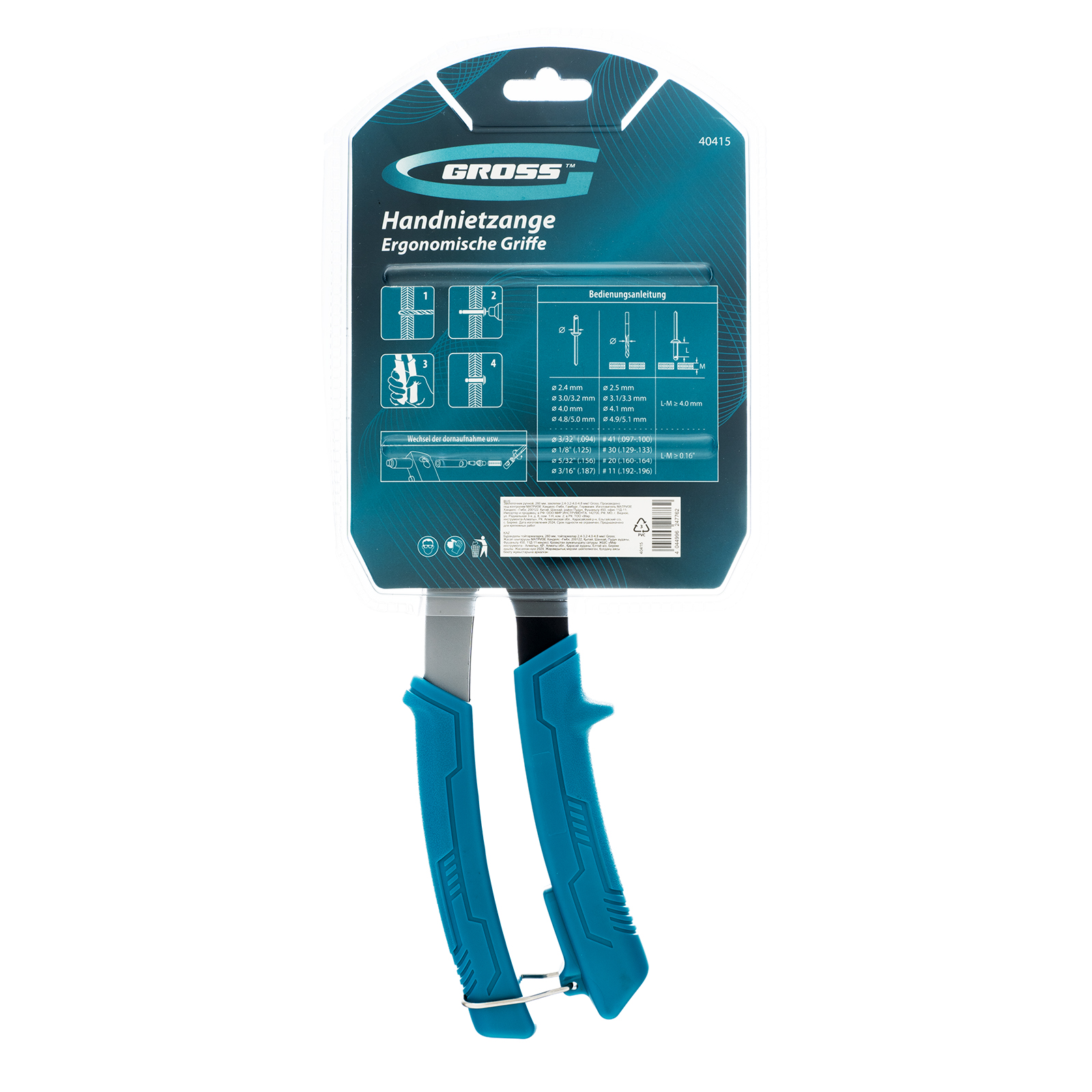 Заклепочник Gross 40415 длиной 260 мм используется для соединения плоских заготовок, металлических профилей и тонкостенных конструкций при помощи вытяжных заклепок из стали типоразмера 2,4-4,0 мм, алюминия (2,4-4,8 мм) и «нержавейки» (2,4-3,2 мм). Обеспечивает быстрое и надежное крепление. Соответствующие сменные головки входят в комплект поставки. Инструмент будет полезен на строительной площадке, в ремонтной мастерской, а также в быту.